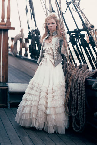 Vivienne West woodHave a romantic Pirates of Penzance notion of nautical? All these gowns above and below would be perfect for the wedding on board an historical sailing ship.